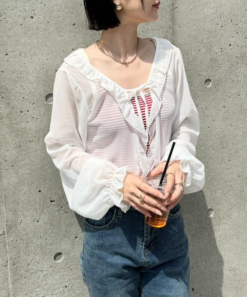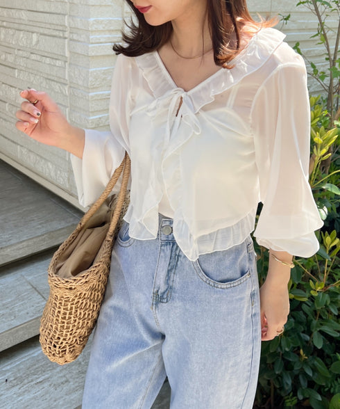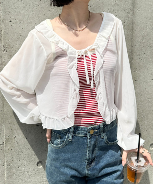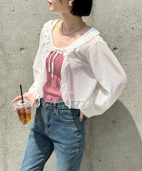 1枚あると便利なシアーボレロ♪フロントリボンでトップスとしても◎■Pointボリュームスリーブでサッとゆったり羽織れるシルエットがトレンド感たっぷりです! シアー素材で抜け感も◎ フロントと袖口はフリル仕様でシンプルコーデのワンポイントになります! 袖口はキャンディースリーブでゴム入りなので捲っても可愛いです。 リボンを結べばキャミ合わせでトップスとしても◎ 2WAYで着回しできる万能アイテムです! ■Styleインナーにキャミソールやチューブトップを合わせたコーデがオススメ!キャミソールワンピースの上からカーディガンのように羽織るのも◎ショート丈なのでデニムパンツやスラックス、スカートなどボトムを選ばないのもポイントです! 【CLEA/クレア】 毎日のシンプルスタイルを、さりげなくオシャレに。 casual fashion every day to you. . . シンプルだけど、どこか女性らしい。 さりげないのに、なんだかオシャレ。 上品さと抜け感のある、 大人カジュアルスタイルをご提案します。 ※ご覧のモニター・撮影環境により実際の商品と多少色味が異なって見える場合がございます。予めご了承をお願いいたします。【お買い物をよりお楽しみいただく為に!】▼商品のお気に入り登録ハートをクリック!完売カラーの再入荷や、ラスト1点の通知、セールの際の通知を受ける事ができます。