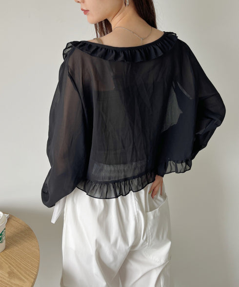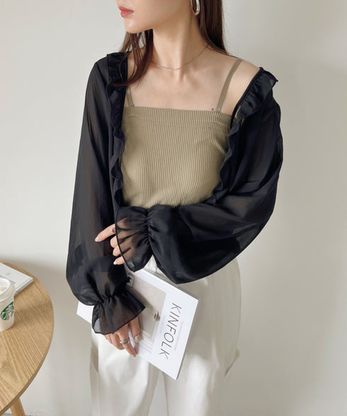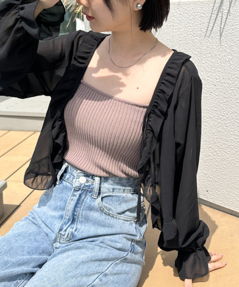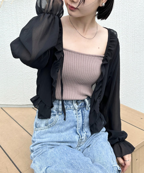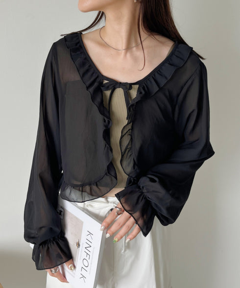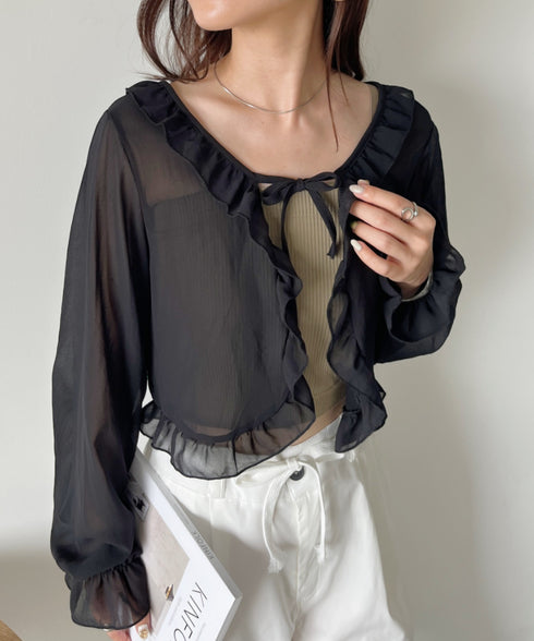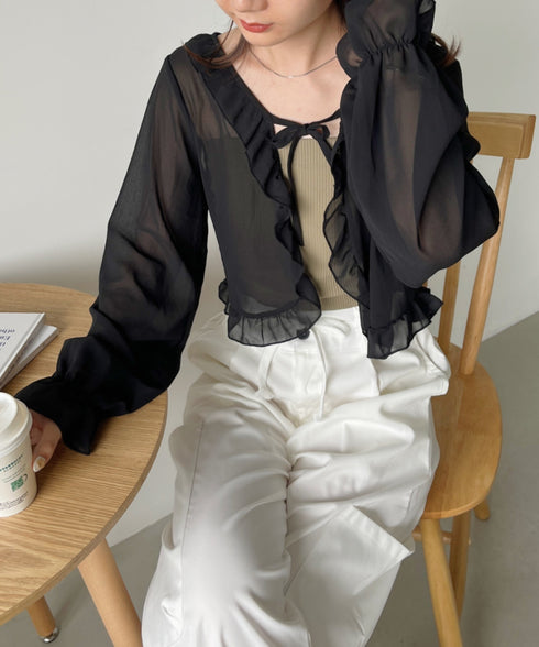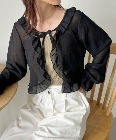 1枚あると便利なシアーボレロ♪フロントリボンでトップスとしても◎■Pointボリュームスリーブでサッとゆったり羽織れるシルエットがトレンド感たっぷりです! シアー素材で抜け感も◎ フロントと袖口はフリル仕様でシンプルコーデのワンポイントになります! 袖口はキャンディースリーブでゴム入りなので捲っても可愛いです。 リボンを結べばキャミ合わせでトップスとしても◎ 2WAYで着回しできる万能アイテムです! ■Styleインナーにキャミソールやチューブトップを合わせたコーデがオススメ!キャミソールワンピースの上からカーディガンのように羽織るのも◎ショート丈なのでデニムパンツやスラックス、スカートなどボトムを選ばないのもポイントです! 【CLEA/クレア】 毎日のシンプルスタイルを、さりげなくオシャレに。 casual fashion every day to you. . . シンプルだけど、どこか女性らしい。 さりげないのに、なんだかオシャレ。 上品さと抜け感のある、 大人カジュアルスタイルをご提案します。 ※ご覧のモニター・撮影環境により実際の商品と多少色味が異なって見える場合がございます。予めご了承をお願いいたします。【お買い物をよりお楽しみいただく為に!】▼商品のお気に入り登録ハートをクリック!完売カラーの再入荷や、ラスト1点の通知、セールの際の通知を受ける事ができます。